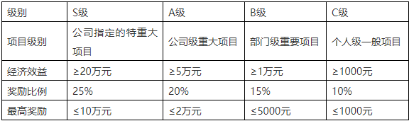 公司推行項目改善從質(zhì)量、成本、生產(chǎn)、交付、安全、設(shè)備改進、團隊及技術(shù)改善類等方面推進,不斷完善制度流程化建設(shè),同時建立獎勵機制,按改善項目重要等級分S級、A級、B級、C級,按級別比例進行最高獎勵。