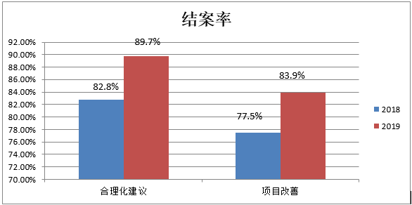 今年截止9月份,合理化建議共接收并被采納39項,結(jié)案35項,4項還在如期進展中,結(jié)案率89.7%,改善項目立項31項,結(jié)案26項,5項在如期進展中,結(jié)案率83.9%。同比去年的合理化建議結(jié)案率82.8%和項目改善結(jié)案率77.5%提升不少。