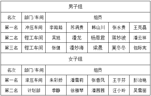 通過每次的消防演練及消防知識(shí)的培訓(xùn),不僅進(jìn)一步增強(qiáng)了廣大員工的防范意識(shí)和自救能力,了解和掌握如何識(shí)別危險(xiǎn)、如何采取必要的應(yīng)急措施等基本操作,以便在事故中達(dá)到快速、有序、及時(shí)、有效的效果。同時(shí)為了鼓勵(lì)廣大員工能更踴躍的融入到消防演練的集體中,在此次演練評(píng)選出男子組前三名、女子組前兩名,并頒發(fā)了獎(jiǎng)狀及獎(jiǎng)金,以資鼓勵(lì)。獲獎(jiǎng)名單如下: