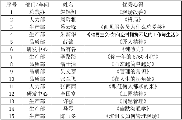 本次為第四季度讀書(shū)心得評(píng)選活動(dòng),經(jīng)總裁辦校對(duì)、審核,從100多篇心得中初選出30篇,再根據(jù)主題明確、立意新穎、結(jié)合工作實(shí)際、文字通順完整等篩選出16篇優(yōu)秀心得,其中獲得本季度“最佳讀書(shū)心得”得主是生產(chǎn)部潘靈橋《不會(huì)帶團(tuán)隊(duì),你就只能干到死》。其余優(yōu)秀文稿如下:
