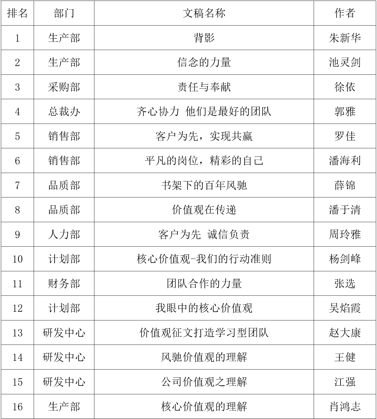首先,評審組10位評委根據(jù)價(jià)值觀主題、文稿內(nèi)容,觀點(diǎn)表達(dá)清晰度,事實(shí)案例,語言表達(dá)流暢,文稿整體結(jié)構(gòu)完整性,幾個(gè)方面對稿件進(jìn)行了認(rèn)真的打分,再依據(jù)分值排名匯總至執(zhí)行總裁最終審核,得出最終評審結(jié)果:生產(chǎn)部朱新華的《背影》一文一舉奪魁,文中沒有華麗的文字,沒有網(wǎng)紅的心靈雞湯,只是簡單的言語,背后卻道出了我們公司的價(jià)值觀,平凡崗位上忙碌的背影深深印刻在每位風(fēng)馳人的心中,文章獲得評委們的一致好評。生產(chǎn)部池靈劍的《信念的力量》立場鮮明,主題突出,讓人感到信念的是一種熱烈的,一種噴薄而出,一種昂揚(yáng)斗志的力量,喜獲二等獎(jiǎng);采購部徐依的《責(zé)任與豐獻(xiàn)》,總裁辦郭雅的《齊心協(xié)力,他們是最好的團(tuán)隊(duì)》并列三等獎(jiǎng)。